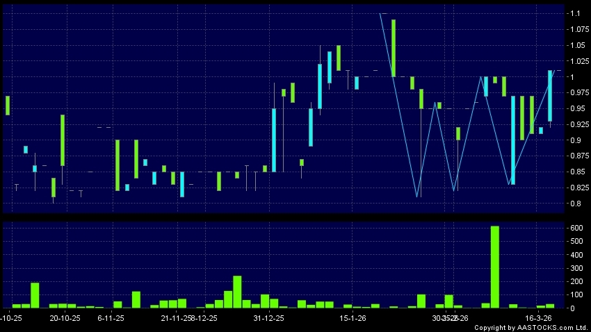 ARTS OPTICAL(01120.HK)  0.000 (0.000%)   shows a triple bottom reversal. Last printed at 1.010; Flattish; on volume of 0.00 shares and turnover of $0.00