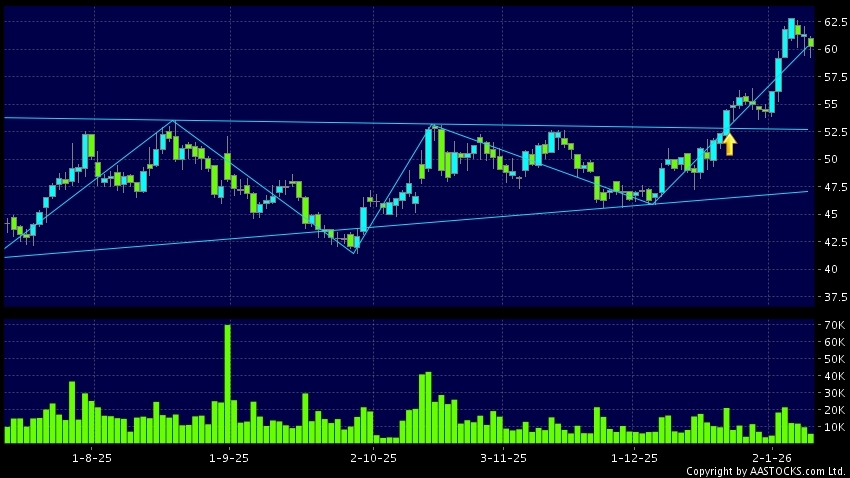 Triangle Breakout means the volatility of price movement is decreasing, stock price finally broke the top of triangle. An upward trend will start.(HK stocks quote is delayed for at least 15 mins.Short Selling Data as at 2026-01-12 12:25.)