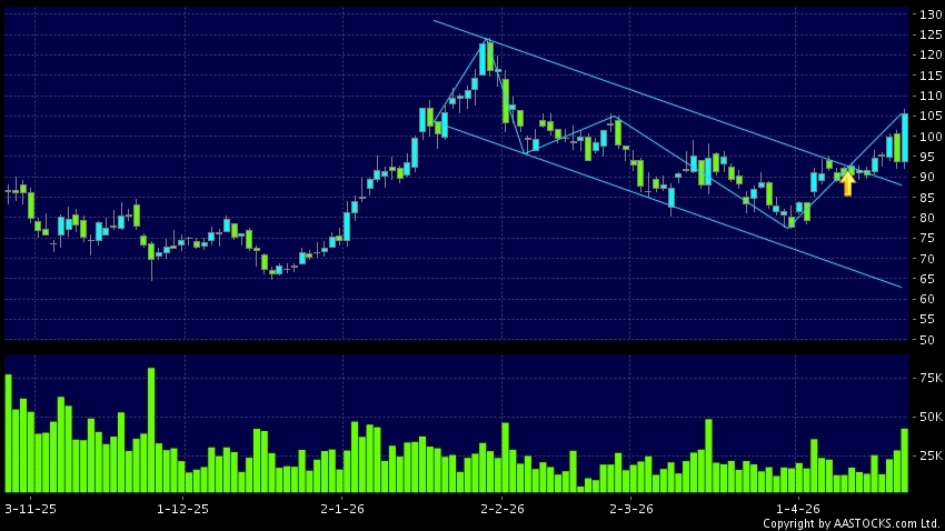 HUA HONG SEMI(01347.HK) appears an upside range breakout. Last printed at 105.600; rose 12.520%; on volume of 42.34M shares and turnover of $4.29BRecent PerformanceIn 3 days: +10.6...