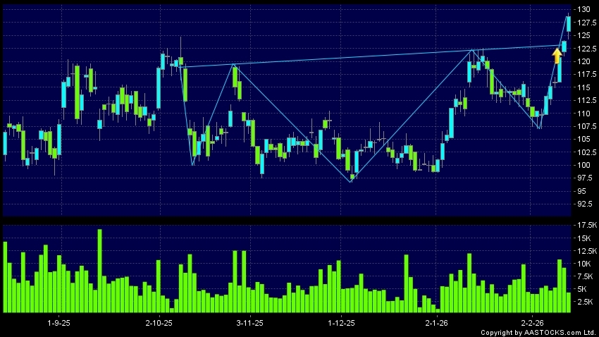WUXI APPTEC(02359.HK) appears an upside breakout, rose above the neckline. Last printed at 128.600; rose 3.793%; on volume of 4.35M shares and turnover of $557.69MRecent Performanc...