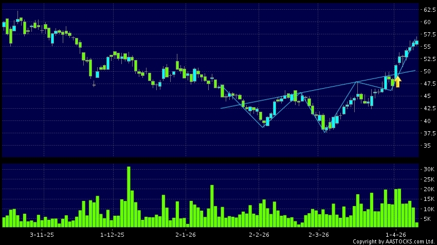 LEAPMOTOR(09863.HK) appears an upside breakout, rose above the neckline. Last printed at 56.100; rose 0.628%; on volume of 3.23M shares and turnover of $181.67MRecent PerformanceIn...