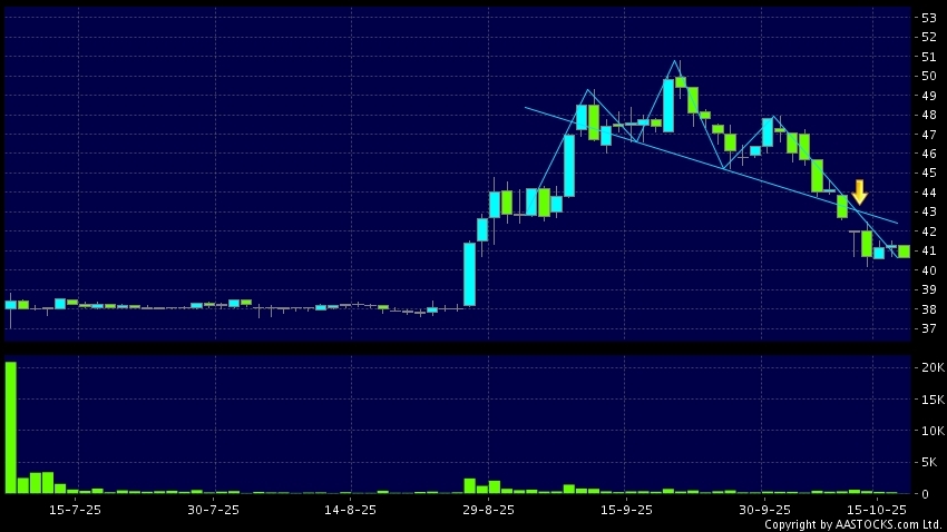 富衛集團(01828.HK)  +0.380 (+0.949%)   呈現頭肩頂向下突破。現價報40.620,下跌1.646%,成交量7.26萬股,成交額2.96百萬。