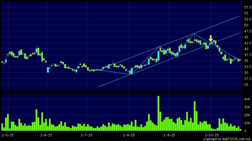 區域突破指股價在過去的一段時間只在一個範圍在內活動,然後股價下跌作出突破,跌穿區域的底部,技術走勢偏軟。(港股報價延遲最少十五分鐘。沽空資料截至 2025-10-24 16:25。)